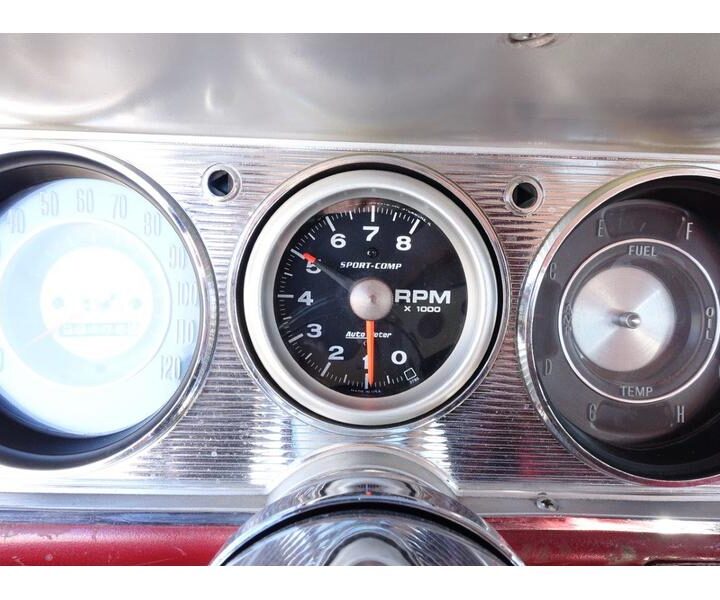 This classic Chevelle has power front disc brakes, power steering, and air conditioning. Aftermarket parts include an Autometer dash mounted tach and a Grant GT steering wheel. Dash mounted aftermarket gauges above the console replace the “idiot lights” in the dash for accurate monitoring of engine performance.