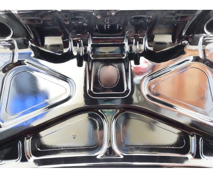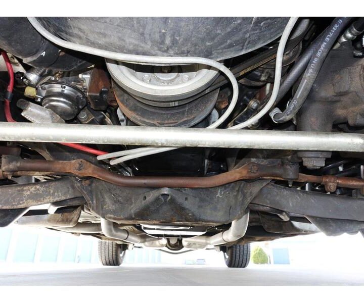 Period correct, Torque Thrust polished chrome wheels from American Racing mounted with BF Goodrich raised white letter radial tires create the aggressive look. The undercarriage is clean and driver quality, typical of a weekend toy used for car shows and pleasure cruises. There is no rust on the car. Pics of the trunk with the mat removed show a clean floor and wheel wells.